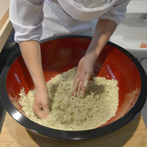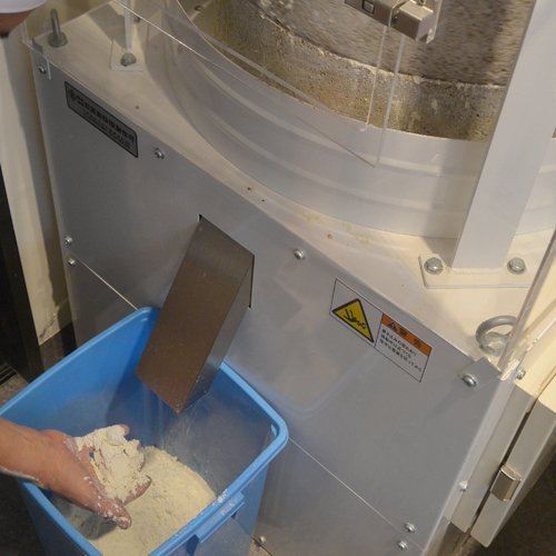 殻の取り除かれた「丸抜き」を石臼に入れ製粉します。蕎麦の実が丸ごと轢かれ、甘さ、うま味、香り、粘りと蕎麦の全てが引き出されます。 挽きたての粉は、つかむと指紋が残るくらい「しっとり」しています。石臼で轢かれた蕎麦粉は、篩にかけられ甘皮を取り除き、洗練された蕎麦粉に仕上がります。