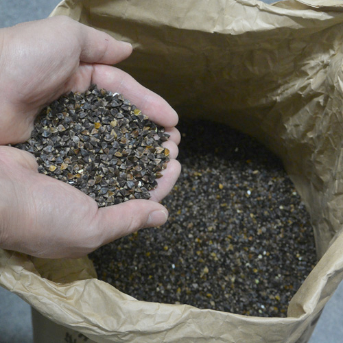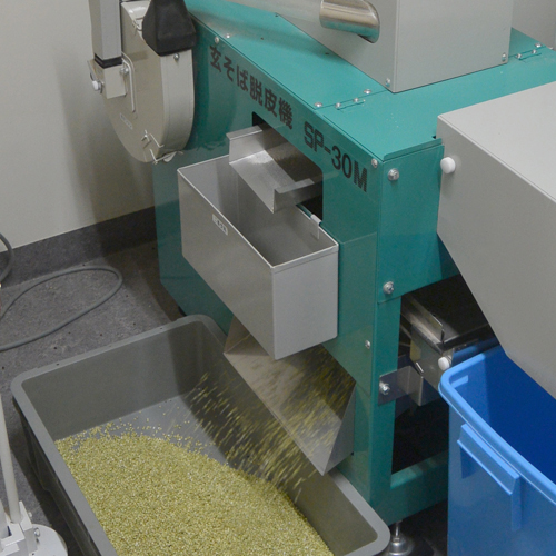 玄そばで保存していた蕎麦を機械で丁寧に脱皮し、「丸抜き」という状態にします。皮を綺麗に取り除くことにより、雑味がなくなり、直前に皮を剥くことで鮮度を保ちます。
