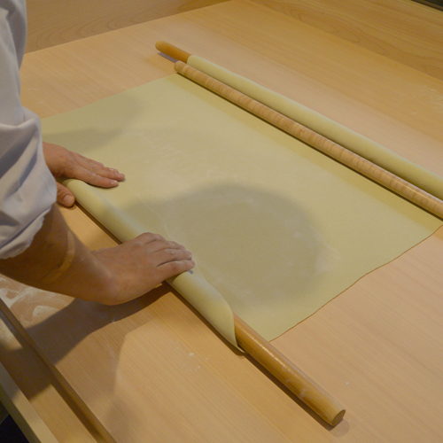 三本の麺棒を使い、乾かないように素早く四角に延していきます。均一の厚さ、そして喉越しの良い1.2mmの厚さに仕上げていきます。