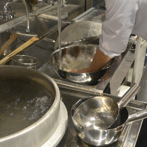 そばを捏ねる水もそうですが、茹でる水、洗う水、化粧水(最後に締める水)と全てに浄水器(シーガルⅣ)を備え付けてます。その水と大きな釜と火力で短時間で蕎麦を美味しく茹で上げます。